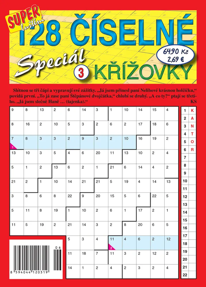 Číselná křížovka se nedá k obyčejné křížovce přirovnat a získává si stále větší oblibu. Jedná se o luštění, při němž je třeba pro odkrytí tajenky nejprve přiřadit číslicím písmena a z nich pak skládat slova. K řešení tak stačí opírat se jen o logické úvahy a není nutno hledat výrazy ve slovnících či jiných pramenech. Tento časopis má 128 stran.