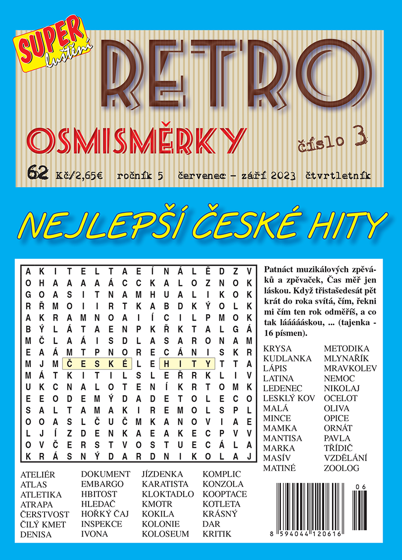 Připravili jsme pro Vás nové číslo oblíbeného časopisu Retro osmisměrky, tentokrát s obsahem „Nejlepší české hity.“ Spousta písní se zapsalo do naší paměti a ty nejznámější jsme si dovolili dát do osmisměrek. Doufáme, že vás touto náplní mile potěšíme a zůstanete i nadále našimi věrnými luštiteli.
