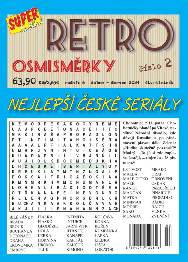 Připravili jsme pro Vás nové číslo oblíbeného časopisu Retro osmisměrky, tentokrát s obsahem „Nejlepší české seriály“. Pokud jste milovníky klasických českých seriálů, jistě si rádi připomenete zábavnou formou ty nejlepší scénky. Doufáme, že vás touto vtipnou náplní mile potěšíme a zůstanete i nadále našimi věrnými luštiteli.